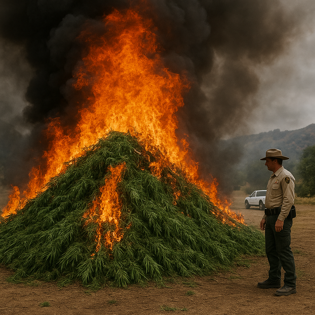 Burning cannabis plants seized by California officials, symbolizing compliance risks for cannabis businesses.